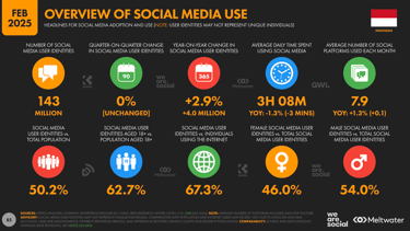 Sebagai gambaran, per awal tahun 2025, tercatat ada 143 juta (sekitar setengah dari penduduk Indonesia) pengguna aktif media sosial di Indonesia dengan rata rata penggunaan sekitar 3 jam dalam satu hari (berdasarkan laporan We Are Social). Angka ini menunjukkan betapa besarnya potensi audiens yang dapat Anda jangkau dan pahami.